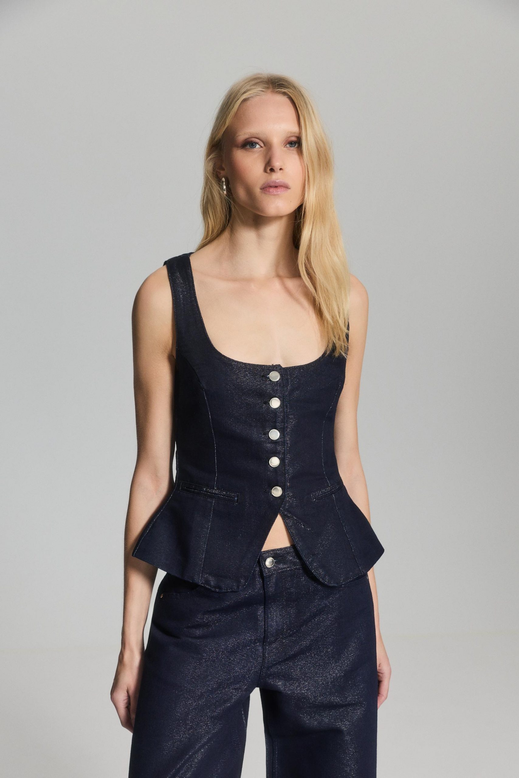 Description: Capture the energetic spirit of modern luxury with the Cobalt Archive Shimmery Waistcoat. Characterized by its unique architectural silhouette and sophisticated indigo palette, this piece offers a statuesque and creative take on artisanal essential tailoring. The construction features provocative shimmery denim textures and refined technical button-up detailing that ensures a polished aesthetic for creative leadership roles or active social retreats. Crafted from premium high-density shimmery denim with structural integrity and a fluid modern profile, it maintains a sharp and authoritative aesthetic while the industrial finish adds a tactile designer edge. Its rich structural dimension serves as a timeless statement of refined luxury for the modern individual who appreciates an artisanal designer edge.